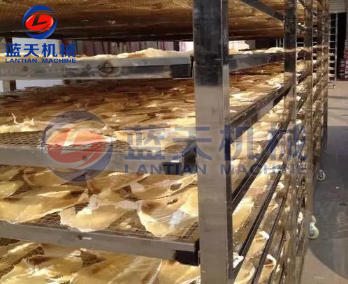 4、烘干:將魚(yú)體洗刷一次,除去沾染的污物,滴干水后,排放于特制的烘干盤(pán)上。推進(jìn)熱泵烘干房,開(kāi)啟主機(jī)的控制面板進(jìn)行烘干,烘干過(guò)程由電腦版全自動(dòng)控制,無(wú)需人工值守,一般海魚(yú)的烘干時(shí)間在22——28個(gè)小時(shí)左右。