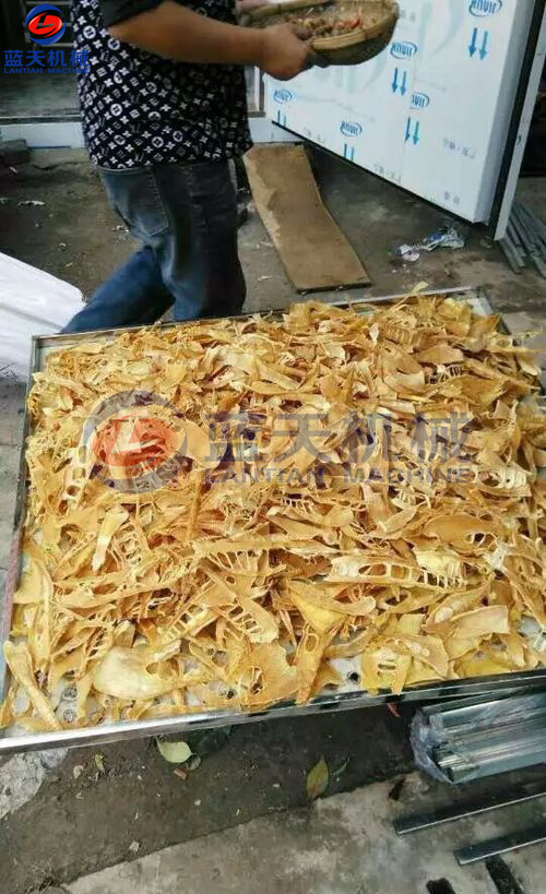壓制好的片狀竹筍裝入物料車托盤,進(jìn)入烘干房進(jìn)行烘干。