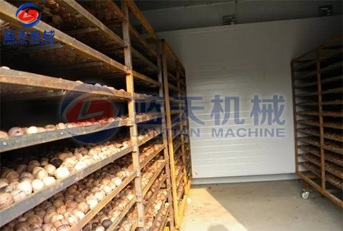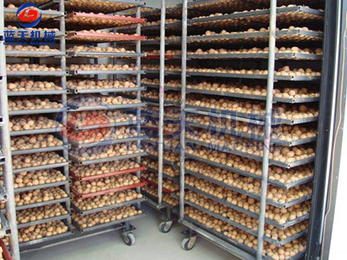 脫青皮后8小時(shí)內(nèi)入倉(cāng)上架排濕烘烤,排濕溫度35-40℃,烘烤時(shí)間12-15小時(shí),果殼表面水分散失,顏色由黑褐轉(zhuǎn)為褐色時(shí)排濕結(jié)束。