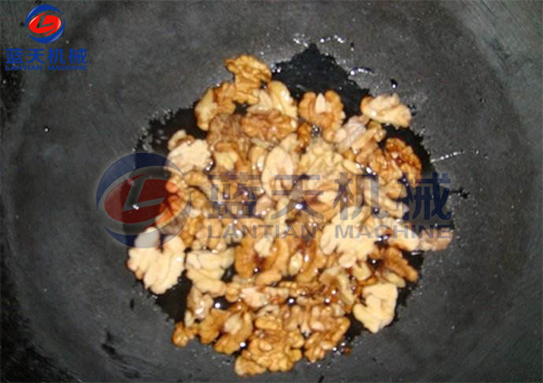 在夾層鍋中加入20――30升水,再加入60千克甜菜糖、30千克葡萄糖和10千克果葡糖漿,邊攪拌邊加熱至沸,視全部溶解后,加入檸檬酸100――200克。把烤好的核桃仁趁熱倒入糖液中,攪拌均勻。出鍋后繼續(xù)在60――80℃溫度下烤干。