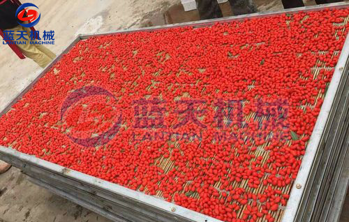 第一階段是升速干燥階段。干燥室內(nèi)溫度上升到35℃-40℃,循環(huán)風(fēng)速2.3米/秒,溫度37℃-45℃。循環(huán)風(fēng)速1.3米/秒時,熱風(fēng)的傳遞和鮮果游離水分的擴散蒸發(fā)加快,尤其是果實皮層失水多達50%,表皮出現(xiàn)曲皺,果肉內(nèi)含結(jié)構(gòu)水也從皮層氣孔開始慢慢滲出蒸發(fā),次期的升速脫水,果內(nèi)糖分濃度加大,抑制了果內(nèi)活化酶的活性,保護了多糖、維生素、氨基酸等主要成分不被轉(zhuǎn)化或損失,尤其對紅色素保護好,干燥的果實色紅質(zhì)量高。這個階段歷市時20個小時左右。