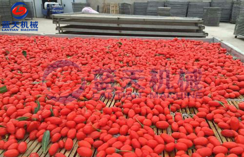 枸杞鮮果干燥的普遍現(xiàn)象是果實表面水分擴散大于內(nèi)部擴散速率,果內(nèi)含游離水外滲速率大于結(jié)構(gòu)水外滲速率,這是枸杞鮮果內(nèi)含糖分高導(dǎo)致脫水干燥困難的緣故。如果干燥室內(nèi)溫度過高,鮮果表面水分散失過快,而果內(nèi)水分的外滲又供不上來,則表皮會起泡,阻塞了排水氣孔,反而使果內(nèi)水分排不出來,此時皮層已脫色、品質(zhì)下降。所,鮮果先進行表面油脂冷浸處理,加上適宜的溫度和風(fēng)速,在表皮脫水的同時通過氣孔透入果內(nèi)的溫度升高,有利于果內(nèi)的水分排出,從而加快了干燥速度,并能保證烘干質(zhì)量。