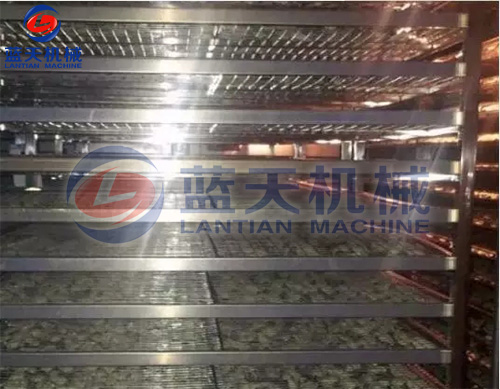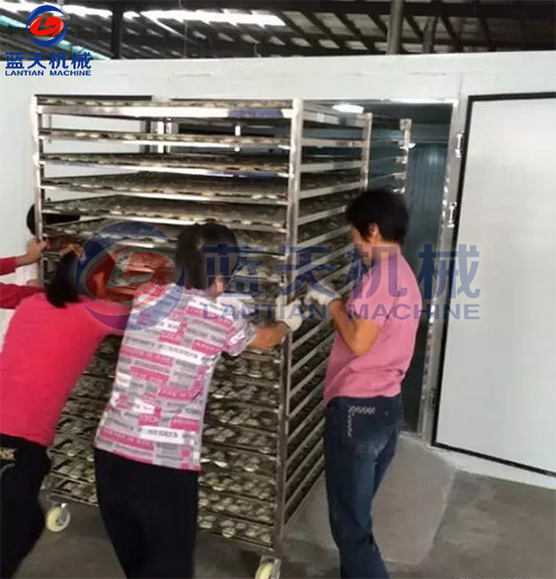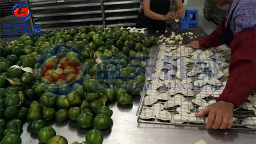 2、剝好的陳皮由車間工人集中運(yùn)至裝料區(qū),由裝料工人開始裝入物料托盤,上物料架,馬上要準(zhǔn)備大批量烘干咯。