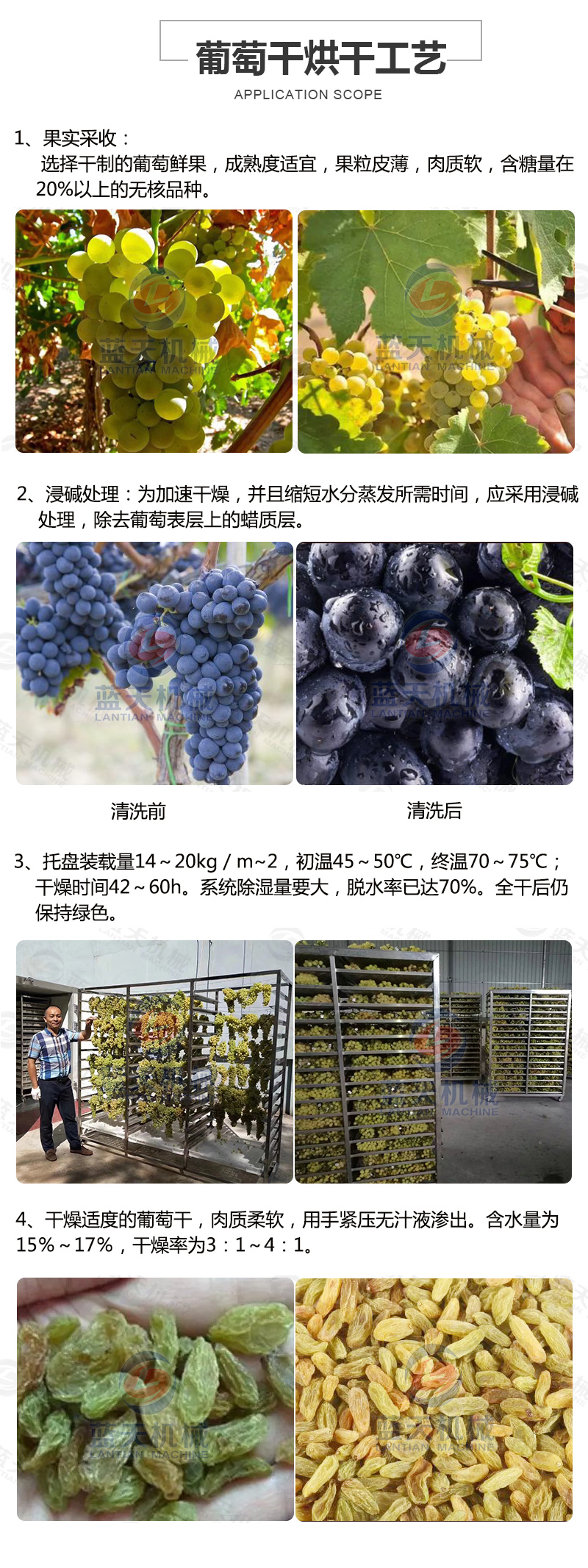葡萄干烘干機制造葡萄干的工藝流程:原料選擇→洗果→干制→包裝