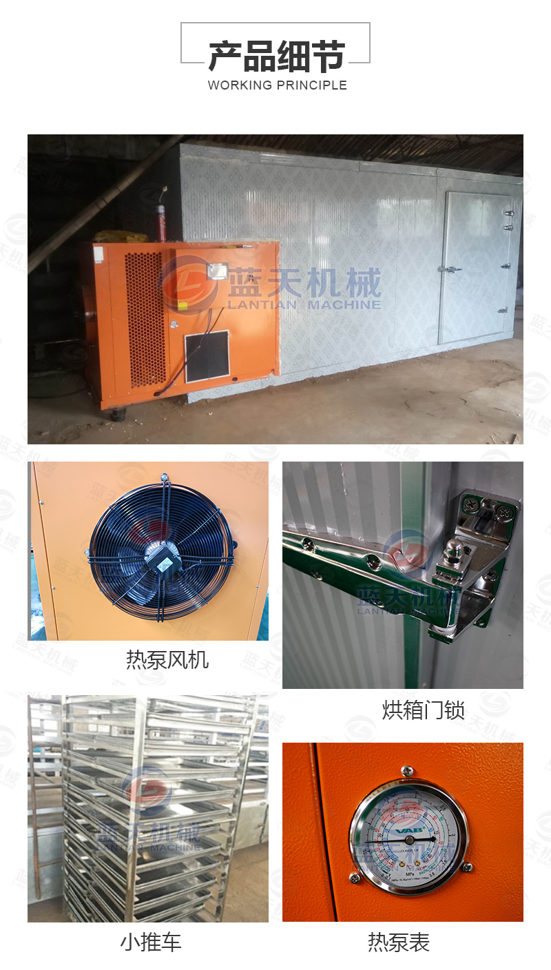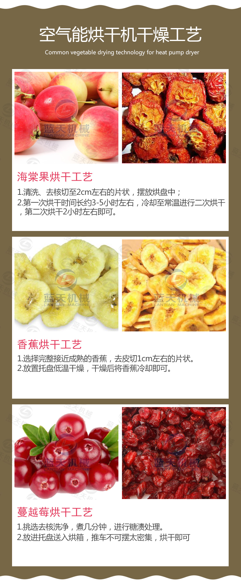 2.葡萄干烘干機熱泵烘干:托盤裝載量14~20kg/m~2,初溫45~50℃,終溫70~75℃;烘干時間42~60h。系統(tǒng)除濕量要大,脫水率已達70%。葡萄全干后仍保持綠色。烘干干燥適度的葡萄干,肉質(zhì)柔軟,用手緊壓無汁液滲出。含水量為 15%~17%,干燥率為3:1~4:1。