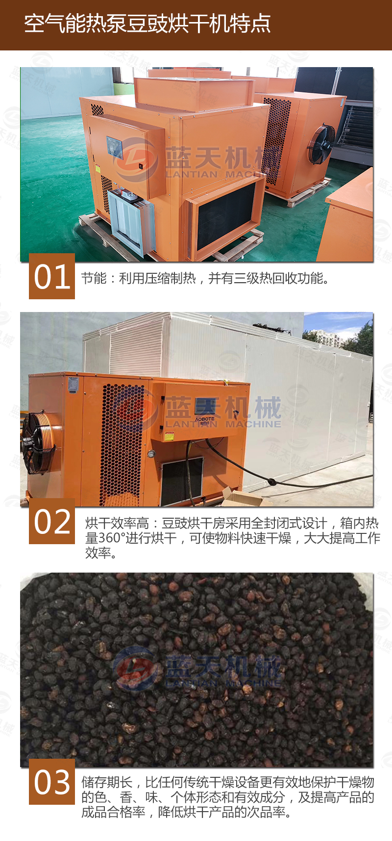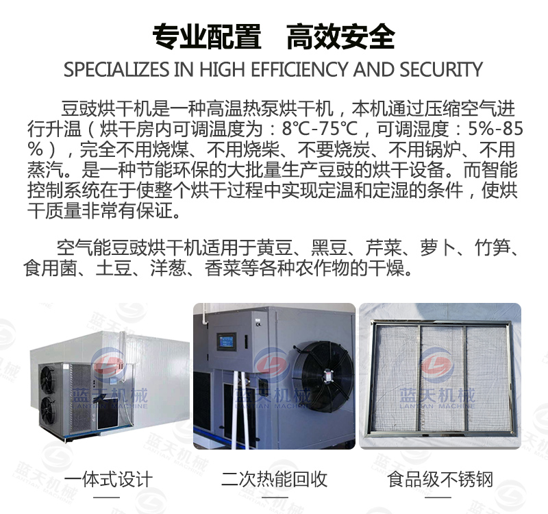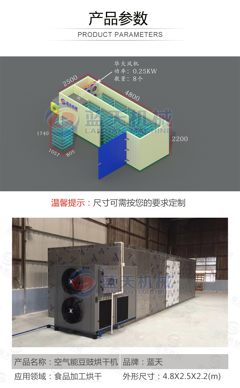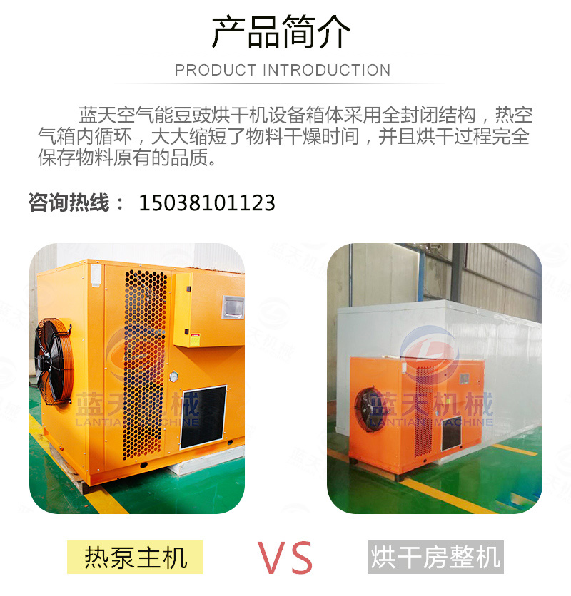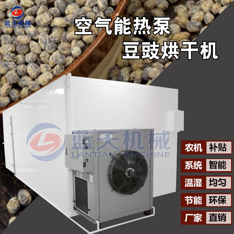 豆豉富含蛋白質(zhì)、各種氨基酸、乳酸、磷、鎂、鈣及多種維生素,色香味美,我國(guó)南北部都有加工食用。但若不注意加工藝,會(huì)致使品質(zhì)下降,甚至霉變,造成經(jīng)濟(jì)損失。傳統(tǒng)上使用太陽(yáng)光曬制,但是生產(chǎn)效率低下,并且在曬制過(guò)程中極容易有污染,本文介紹使用一種基于空氣能熱泵技術(shù)的豆豉烘干設(shè)備,大大加快了豆豉的生產(chǎn)流程。
