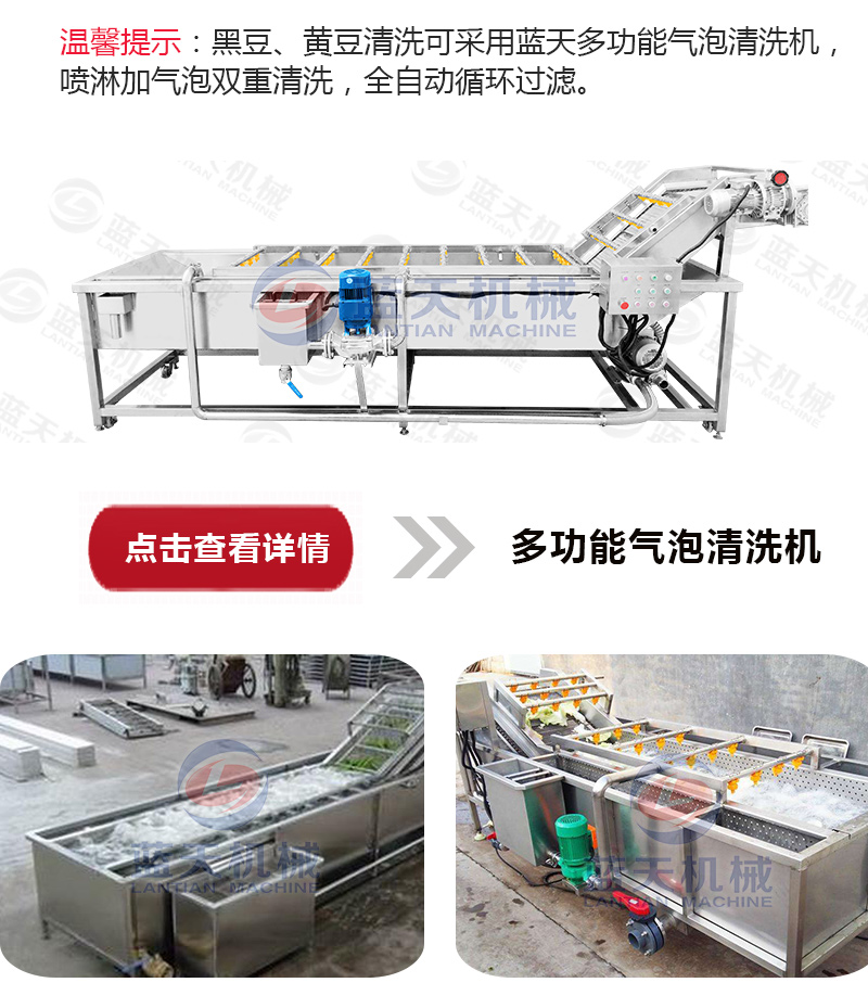 1、原料選擇及清洗:選擇成熟、顆粒飽滿均勻、皮薄肉多、無(wú)蟲(chóng)蝕、無(wú)霉?fàn)€變質(zhì)、并且有新鮮度的黃豆或黑大豆為宜。用清水多次洗去大豆中混有的砂粒雜質(zhì)等。有條件的可以使用自動(dòng)化的果蔬清洗機(jī)來(lái)大批量清洗黑豆。