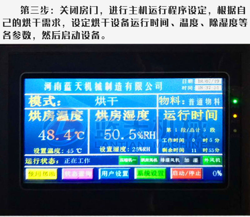 三:將盛放好豆角的物料車推入豆角烘干機(jī)設(shè)備內(nèi),關(guān)閉房門,進(jìn)行主機(jī)運(yùn)行程序設(shè)定,根據(jù)自己的烘干需求,設(shè)定烘干設(shè)備運(yùn)行時(shí)間、溫度、除濕度等各參數(shù),然后啟動設(shè)備。