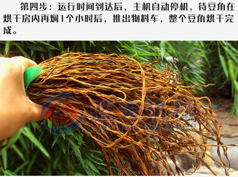 四:運(yùn)行時(shí)間到達(dá)后,主機(jī)自動停機(jī),待豆角在豆角烘干機(jī)內(nèi)再燜1個(gè)小時(shí)后,推出物料車,整個(gè)豆角烘干完成。
