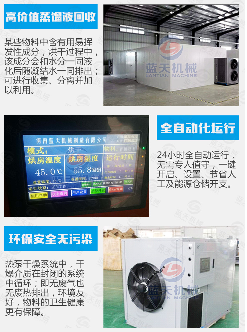 藍(lán)天海產(chǎn)品烘干機(jī)采用觸摸屏控制系統(tǒng),可實(shí)現(xiàn)多個(gè)時(shí)段曲線控溫,操作簡單方便。海鮮烘干機(jī)吸收空氣的熱量并將其轉(zhuǎn)移到房內(nèi),實(shí)現(xiàn)烘干機(jī)內(nèi)的溫度提高,配合相應(yīng)的除濕裝置實(shí)現(xiàn)海產(chǎn)品的烘干干燥。海產(chǎn)品烘干機(jī)設(shè)備由壓縮機(jī)-換熱器(內(nèi)機(jī))-節(jié)流器-吸熱器(外機(jī))-壓縮機(jī)等裝置構(gòu)成一個(gè)循環(huán)系統(tǒng)(主機(jī)+烘干機(jī))。冷媒在壓縮機(jī)的作用下在系統(tǒng)內(nèi)循環(huán)流動(dòng)。它在壓縮機(jī)內(nèi)完成氣態(tài)的升壓升溫過程(溫度高達(dá)115℃),它進(jìn)入內(nèi)機(jī)釋放出高溫?zé)崃考訜岷.a(chǎn)品烘干機(jī)內(nèi)空氣,同時(shí)自己被冷卻并轉(zhuǎn)化為流液態(tài),當(dāng)它運(yùn)行到外機(jī)后,液態(tài)迅速吸熱蒸發(fā)再次轉(zhuǎn)化為氣態(tài),同時(shí)溫度下降至零下20℃-30℃,這時(shí)吸熱器周邊的空氣就會(huì)源源不斷地將熱量傳遞給冷媒。冷媒不斷地循環(huán)就實(shí)現(xiàn)將空氣中的熱量搬運(yùn)到海鮮烘干機(jī)內(nèi)加熱機(jī)內(nèi)空氣溫度,從而實(shí)現(xiàn)能量的幾倍增長,消耗一度電產(chǎn)生的熱量相當(dāng)于傳統(tǒng)電熱絲的4倍以上,達(dá)到效率高節(jié)能的效果。